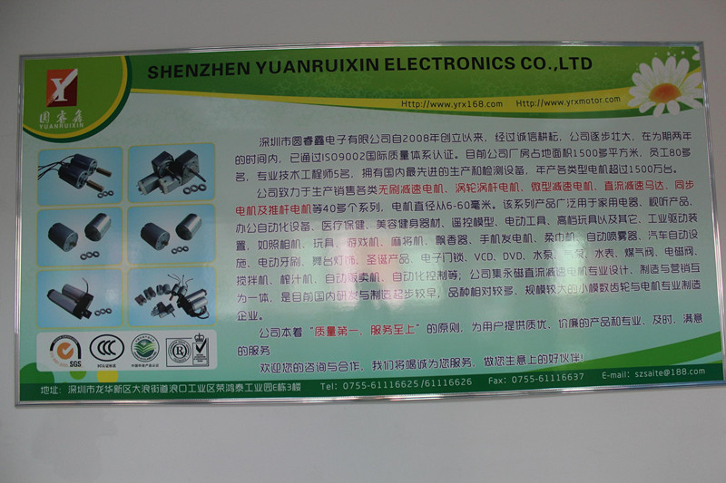 深圳市圓睿鑫電子有限公司自2008年創(chuàng)立以來,經(jīng)過誠信耕耘,在為期兩年的時間內,已通過ISO9001:2000國際質量體系認證。公司廠房占地面積2000多平方米,員工100人,專業(yè)技術工程師6名,擁有國內最先進的生產(chǎn)和檢測設備,年產(chǎn)各類減速電機超過2~300萬臺。因公司發(fā)展需要,于2020年底,將生產(chǎn)基地遷往擁有最美小鎮(zhèn)之稱的東莞市清溪鎮(zhèn),依山傍水,依托美麗的大自然環(huán)境和地方文化,全新的東莞市圓睿鑫電子有限公司將借助深圳母公司平臺,一步步走上新的臺階。 東莞公司將繼續(xù)致力于生產(chǎn)銷售各類無刷減速電機 渦輪渦桿電機,微型減速電機,直流減速馬達,交流手搖發(fā)電機、同步電機及空心杯電機等,電機直徑從6-60毫米為定位,系列產(chǎn)品廣泛用于智能家電、智能辦公自動化設備、智能醫(yī)療、美容健身器材、遙控模型、電動工具、高檔玩具以及其它工業(yè)驅動裝置,如高檔玩具、游戲機、麻將機、飄香器、手機發(fā)電機、柔巾機、自動噴霧器、汽車自動設施、電動牙刷、舞臺燈飾、圣誕產(chǎn)品、智能電子門鎖、VCD、DVD、水泵、氣泵、水表、煤氣閥、電磁閥、攪拌機、榨汁...